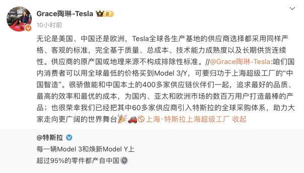 同日上昼,特斯拉环球副总裁陶琳在个东说念主搪塞平台上进行公开复兴,明确否定“供应商的原产国或地舆开始不组成舍弃性法度。”
