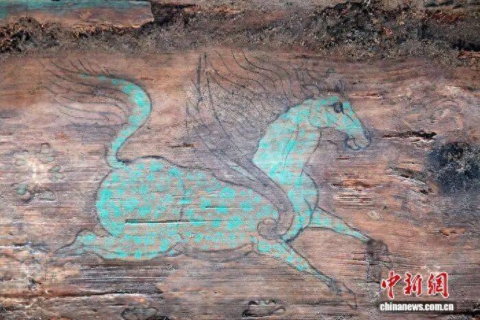 贵寓图:新疆吐鲁番市巴达木东晋唐时辰墓群出土棺木上展翅的飞马。孙自法 摄