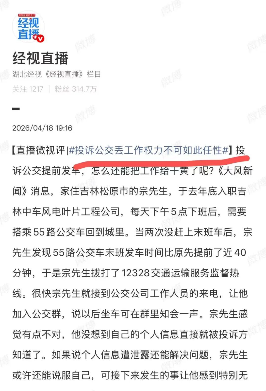吉林松原一个男人高放工,要坐公交末班车,畅达两次没赶上车后他发现公交竟然是提前40分钟就走了。于是男人为了坐上公交车只可反馈问题,但这边才反馈完,那儿信息就露出了,各路东说念主马王人找来!